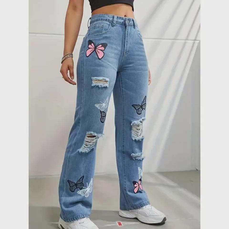 [Design] --- Classic 5 pockets design, butterfly print, high-waisted and button closure. Elevate your style with high-waisted straight-leg jeans that flatter different body shapes, visually elongating your leg line while providing a smoothing effect for a slimmer appearance.